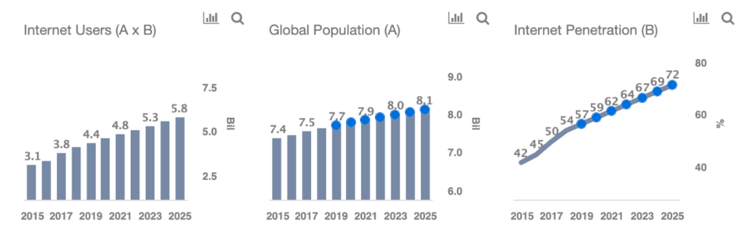 我们假设,到2025年,全球人口将增长到超过80亿,同时互联网普及率将上升到72%。