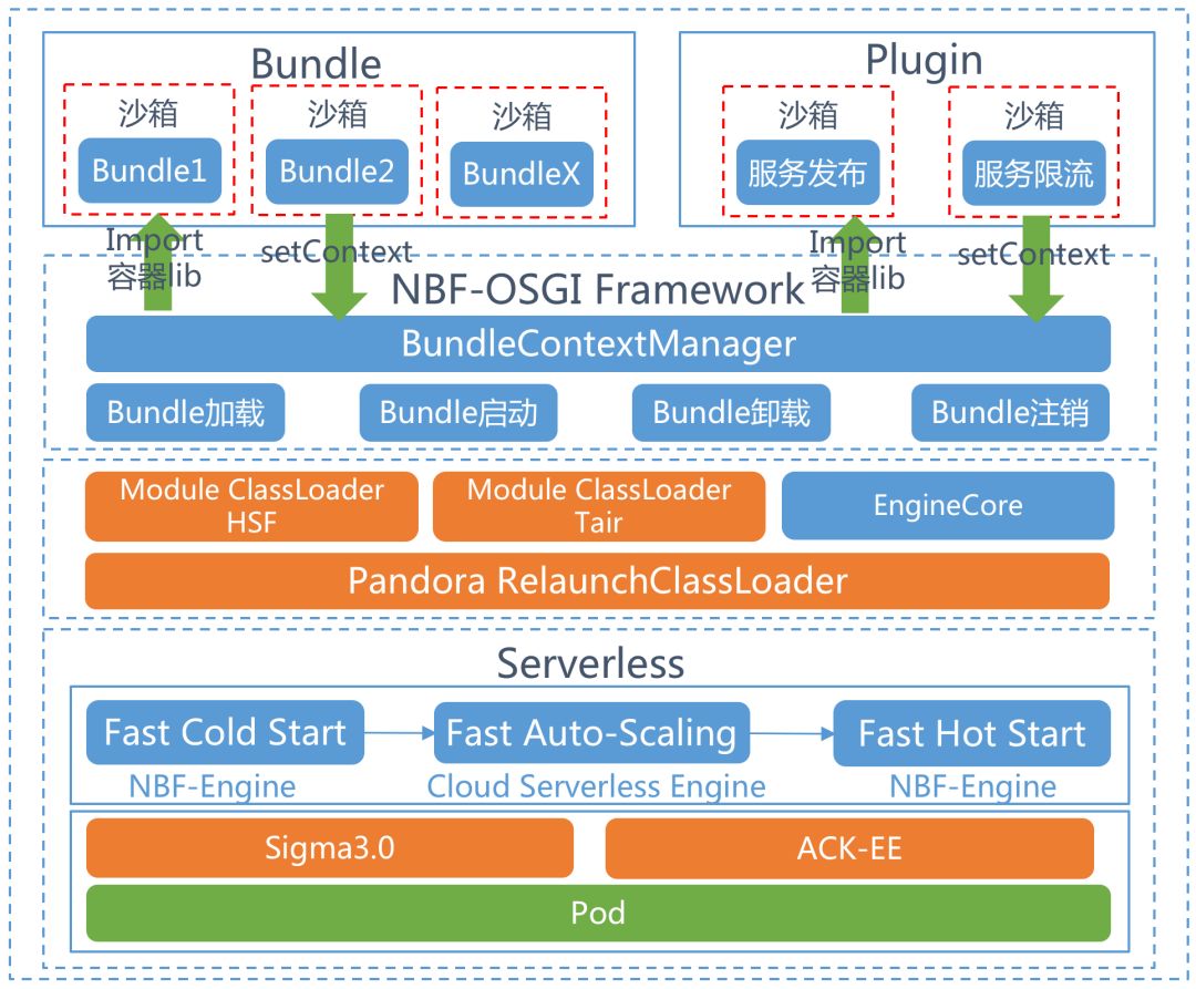 b. Bundle隔离:NBF容器会为每个Bundle建立独立沙箱,从加载机制上保证了Bundle代码级别隔离,避免Bundle之间的类和资源冲突。