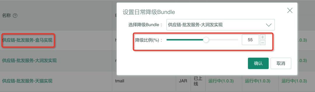 流量管控提供了一种软负载的能力,支持设置Bundle和降级Bundle之间的流量配比,我们仍以Bundle:供应链-批发服务-盒马实现为例,以图为证: