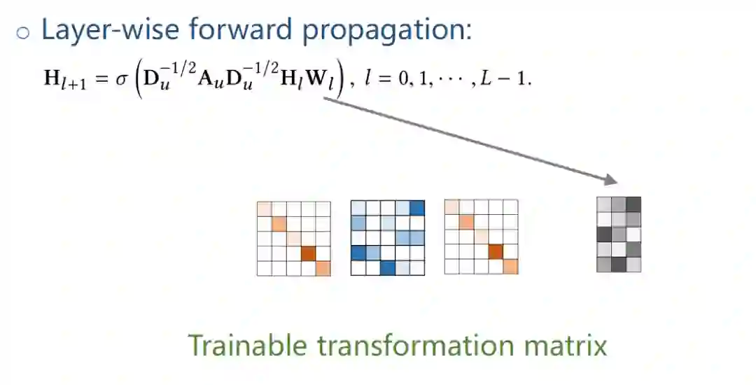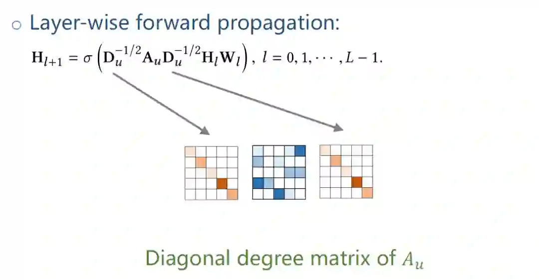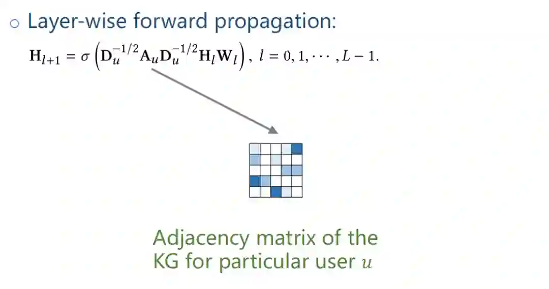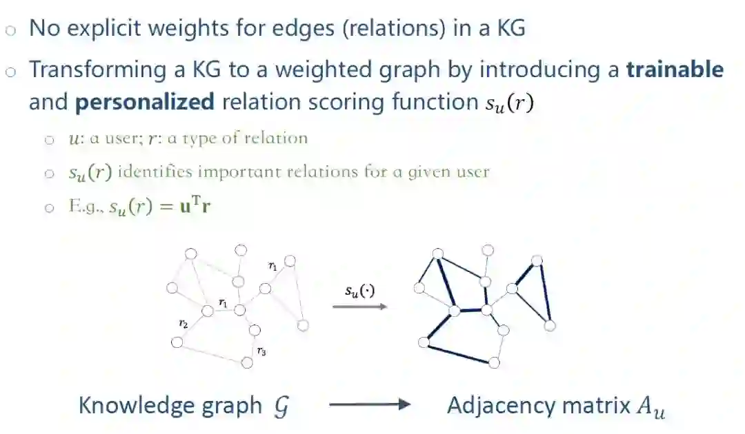 对每个relation打分,从而把KG转换成weighted graph。函数su(r)的输入是user和relation,输出一个分值。核心思想是识别用户关注的类型,比如有些用户偏好同种类的电影,有些用户偏好某个主演的电影。su(r)用来刻画不同用户对不同relation的偏好程度,将user embeding和relation embedding内积,算出相应的分值。把异构KG转换成weighted graph,这样一个graph对应邻接矩阵
