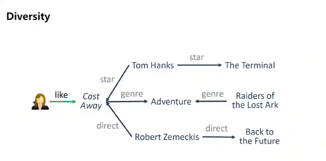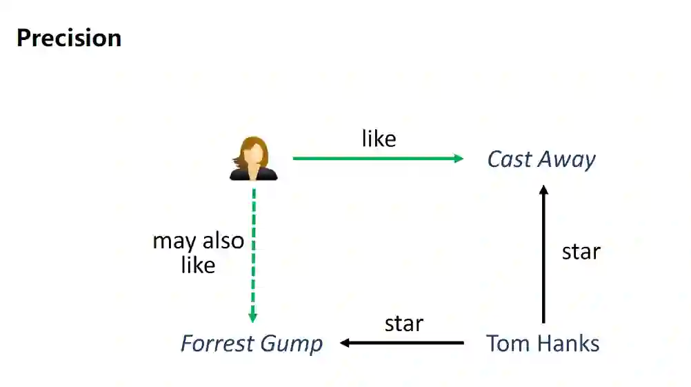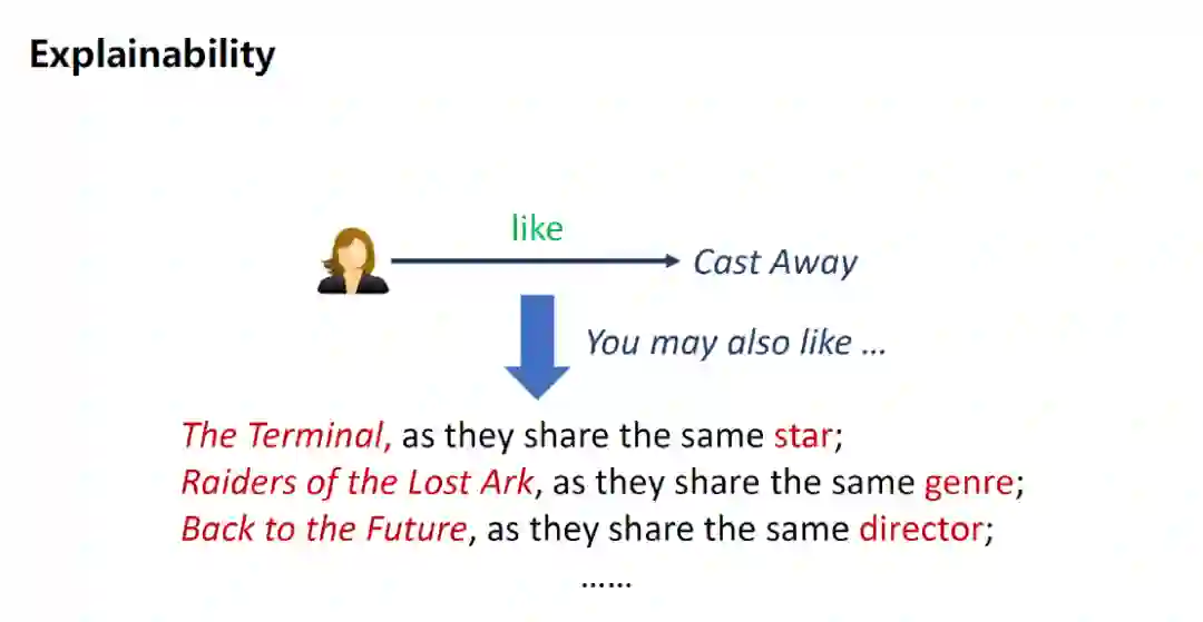 第3个是可解释性 ( Explainability ),可以用KG的path来解释系统为什么会推荐这部电影,如下图某个用户喜欢Cast Away这部电影,系统会推荐The Terminal这部电影,因为他们有相同的主演。