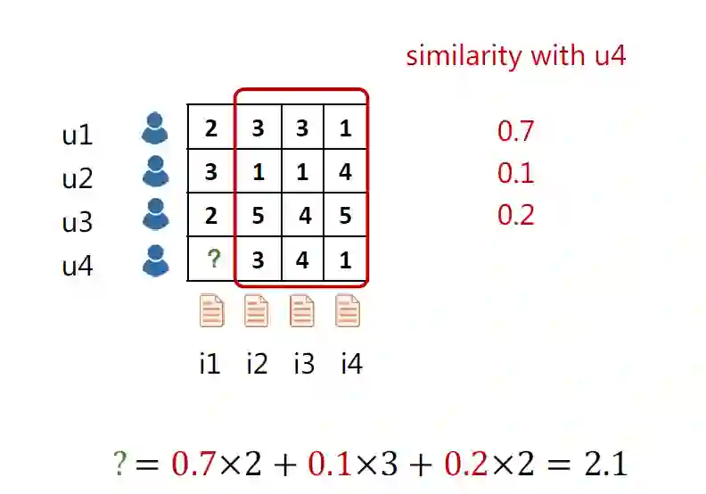 如下图为4个用户对4个物品的打分情况,来预测用户u4对物品i1的评分。通过这4个用户在其他3个商品 ( i2,i3,i4 ) 的打分,计算出其他3个用户和u4用户的相似度,分别是0.7,0.1,0.2,然后用相似度加权平均其他3个用户在i1物品的打分,这样就得到了u4对i1的评分为2.1。