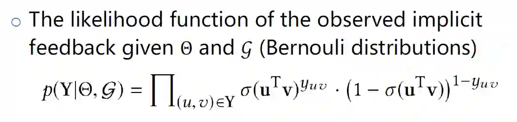 第3项已知参数θ和KG,用户和物品交互的似然函数。这个似然函数是一个伯努利分布,关于用户和物品内积的伯努力分布。
