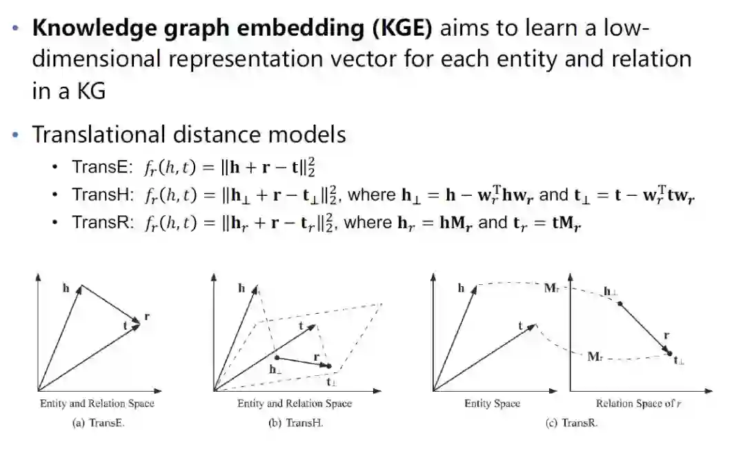 KG 的处理方法中有一类方法叫Knowledge Graph Embedding,KGE。KGE主要是对KG的每个实体 ( entity ) 和每个关系 ( relation ) 学习一个低维的特征。在KGE中有一个基于翻译的距离模型,Translational distancemodels。