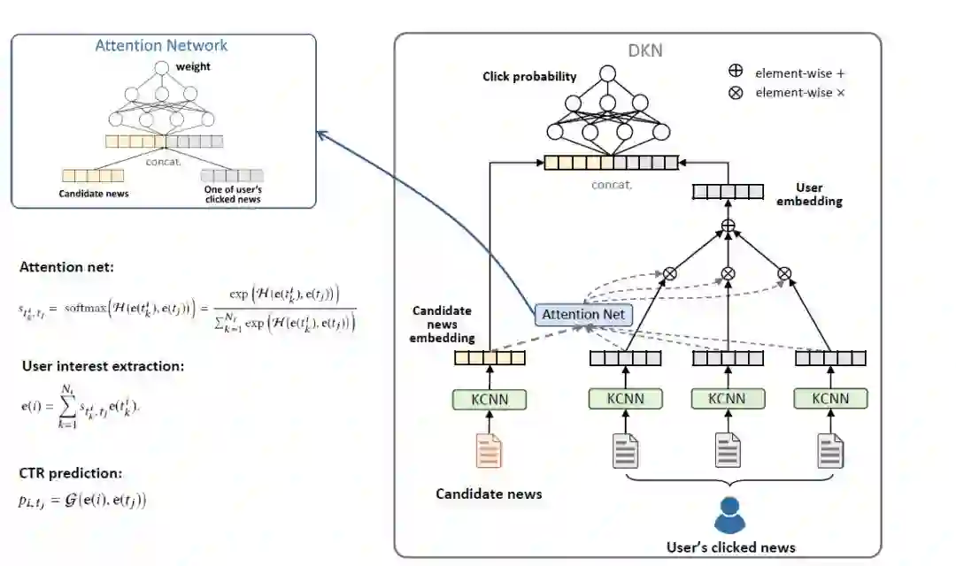 接下来介绍基于KCNN做推荐的方法。如上图假设某个用户已经点击过了3条新闻,来了一个候选新闻,预测该用户对候选新闻的点击率。对这4条新闻做KCNN的embedding映射,得到4个特征向量。因为用户看过的新闻的重要性对候选新闻是不一样的,用Attention Net计算用户看过的每一条新闻和候选新闻的决策分值。用得到的分值加权观看记录,得到User embedding。将user embedding和candidate news embedding拼接,输出一个预测的点击概率,这个就是做预测的DKN模型。