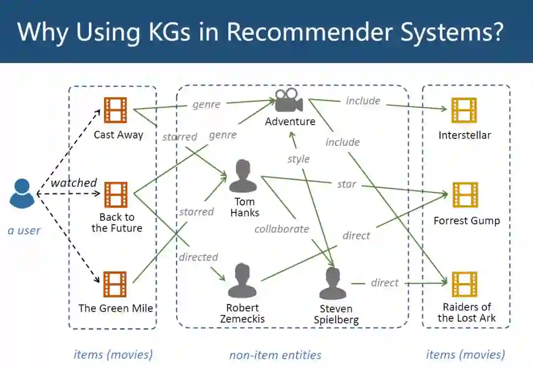 第1个提高推荐系统的精度 ( Precision ),更准确的发现item之间的相似性,如下图2部电影,能通过Tom Hanks做个连接。