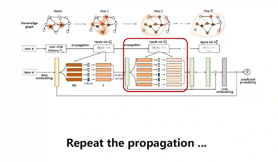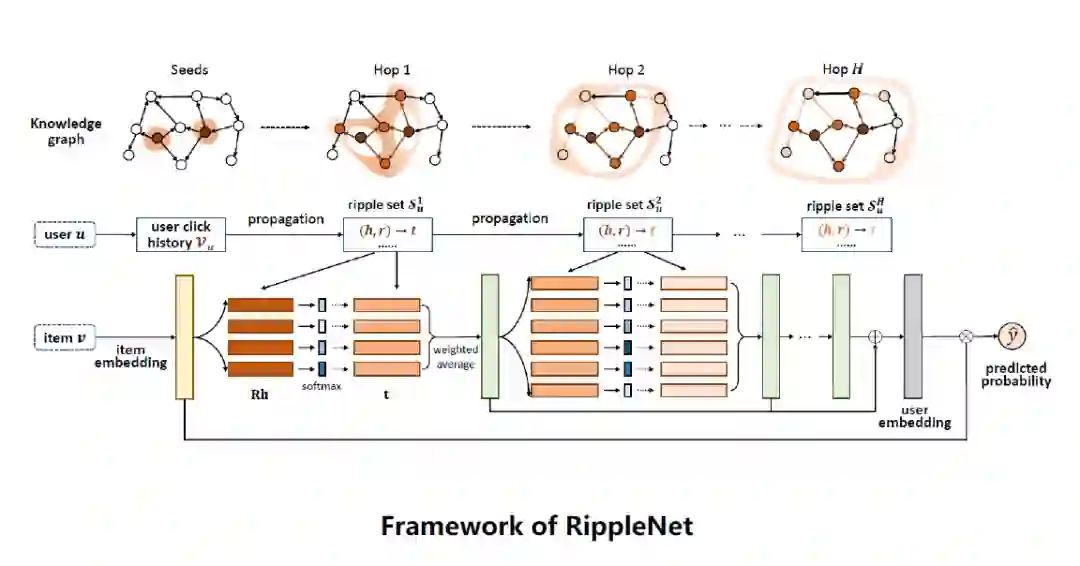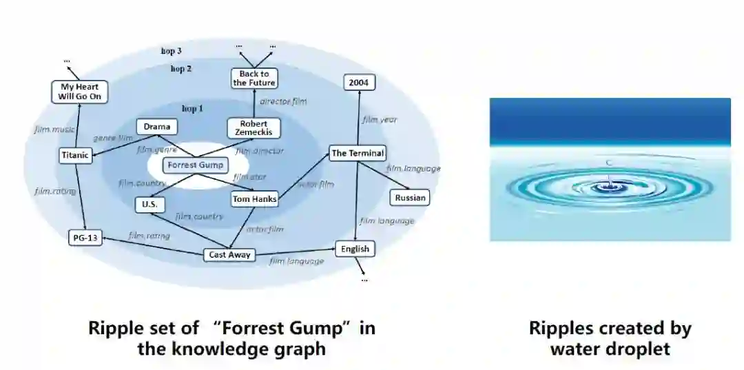 Ripple从名字上理解是水波的意思,水波是一层一层的,那这个算法是指在KG中某个实体,和该实体相连的其他实体也有一跳,二跳,三跳的关系,如上图列出了ForrestGump这部电影对应的3跳的临近实体。
