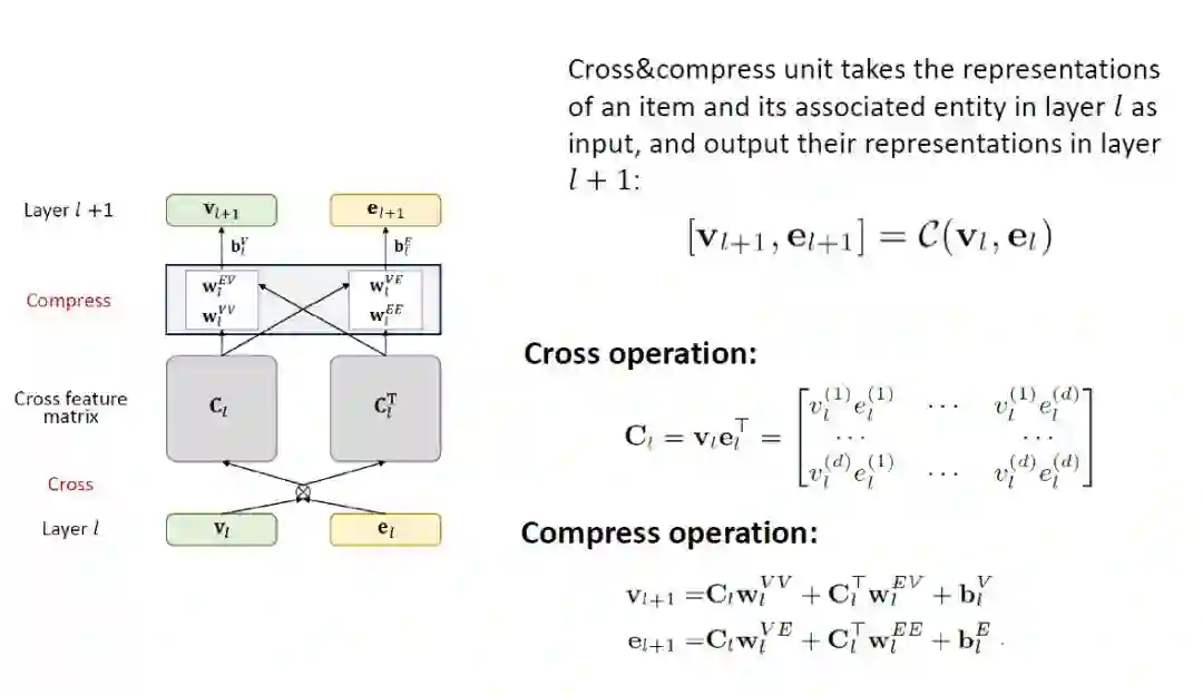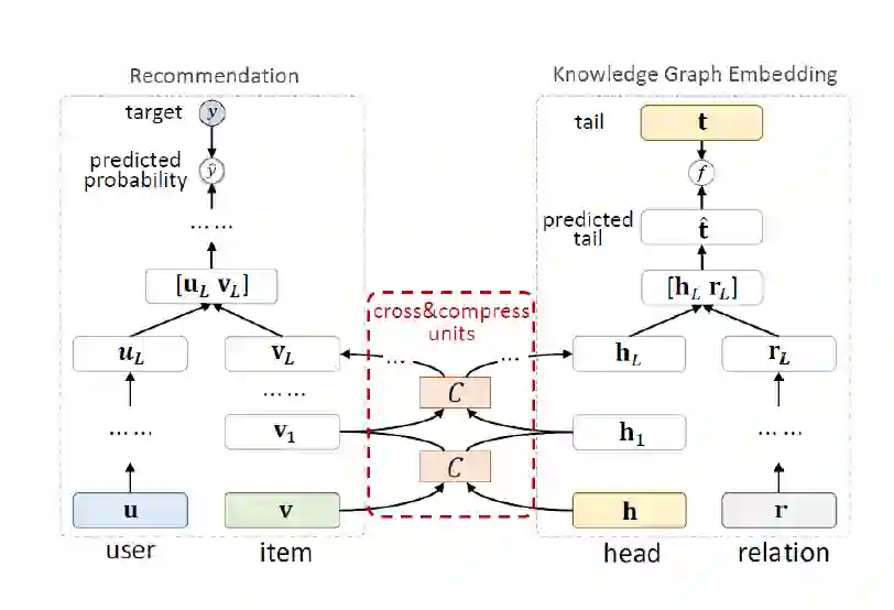 ,item是cross&compress units做的处理,返回一个物品的特征VL,把UL和VL拼接起来,用一个recommendation system函数fRS,输出一个点击预测值。