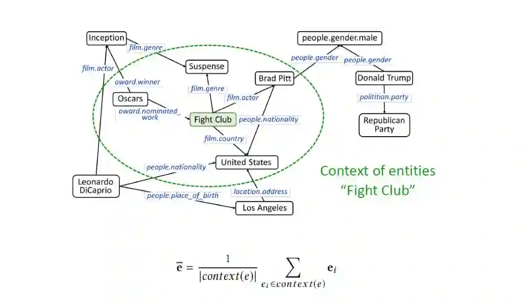 如上图,对于某个实体Fight Club,只有其对应的embedding还不够,在KG中每个实体,连接着好多其他的实体,那这些临近实体就是该实体的上下文,将这些上下文中的每个实体的embedding相加平均,就得到该实体的上下文embedding。如上图公式中ē就是实体
