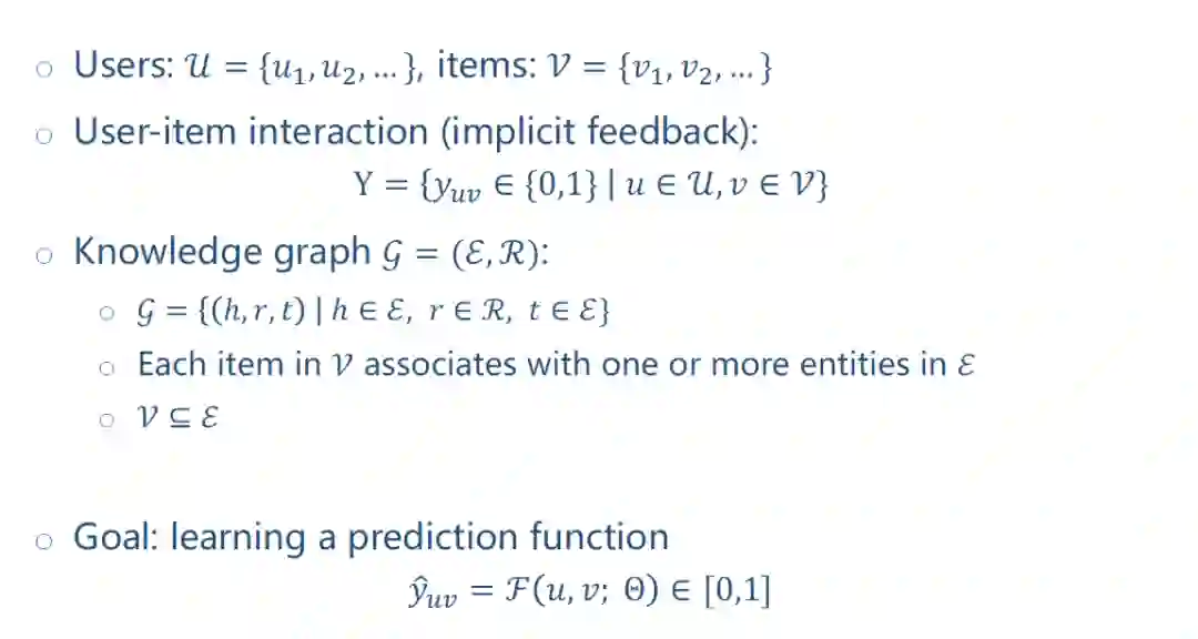 },物品集合V={v1,v2,...},交互矩阵 ( 隐式反馈 ) Y矩阵Y={yuv ϵ {0,1} | uϵU, vϵV},KG包括实体 ( entity ) 和关系 ( relation ),由很多三元组组成。