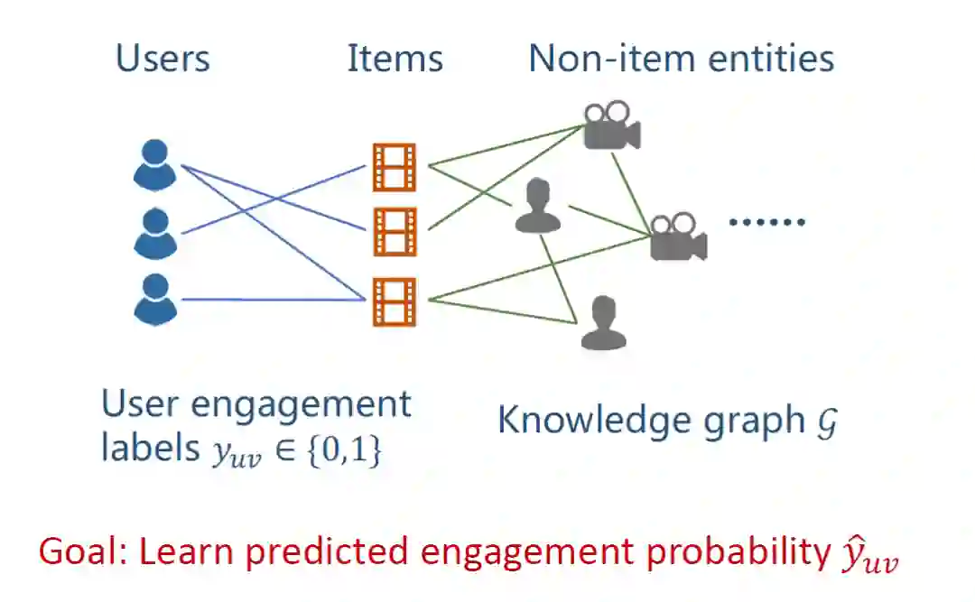 ),一个包括很多non-item实体的KG。图中yuv表示用户u对物品v的一个隐式反馈,即用户有没有点击过这个物品,目标是给定一个新的u-v对,预测点击率yuv。
