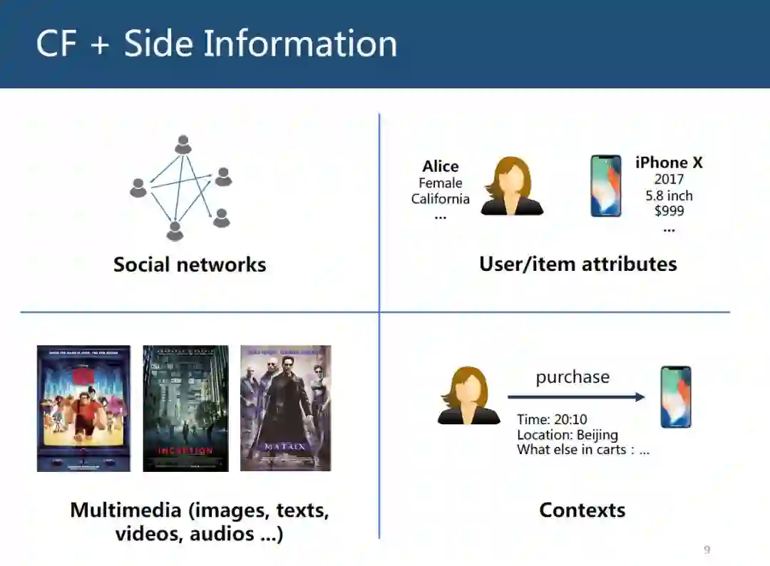 常见的辅助信息:社交网络;用户或商品属性特征;多媒体信息