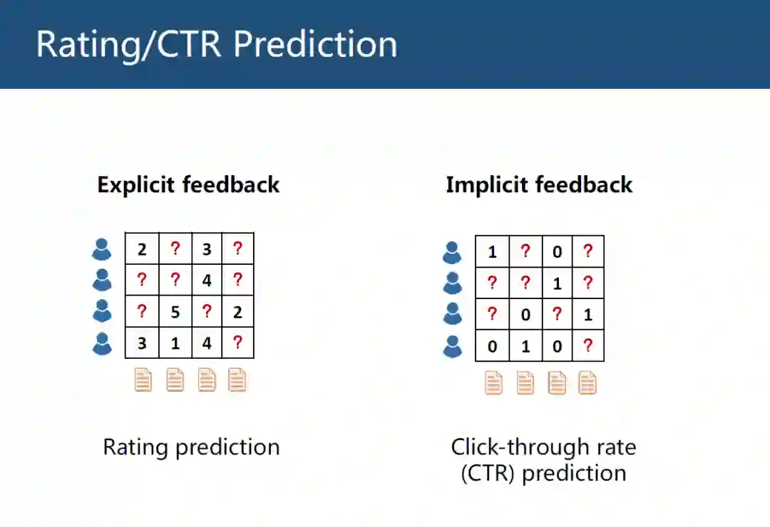 另一个是点击预测 ( CTR Prediction )。右边是点击预测的例子,表格中只有0和1,0表示用户没有点击过,1表示用户点击过,这类数据叫隐式反馈 ( Implicit feedback ),点击预测只能反映用户的非常弱的偏好程度,用户点击了不一定说明用户喜欢,比如逛淘宝,用户只是点击了某个物品就退出了,所以点击物品并不能代表用户的真实感受。