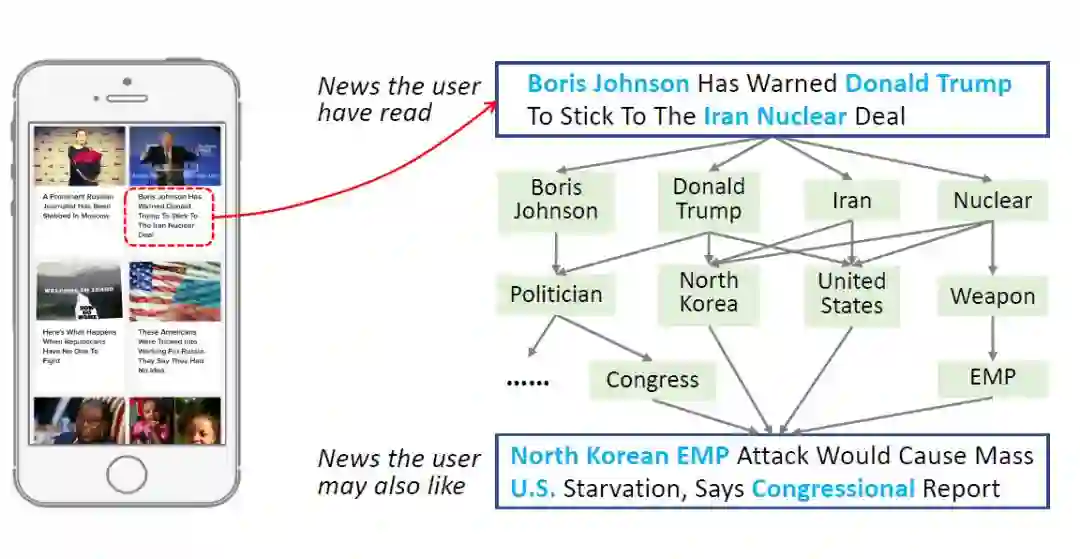 这2条新闻在字面上没有任何相似度,新闻的单词都不一样,但他们是很相关的,这个相关性体现在KG上,他们在低层是相关的,但这种相关性没法从字面意义上得到,这也是为什么要用KG,KG提供了一种item相似度的计算方式。