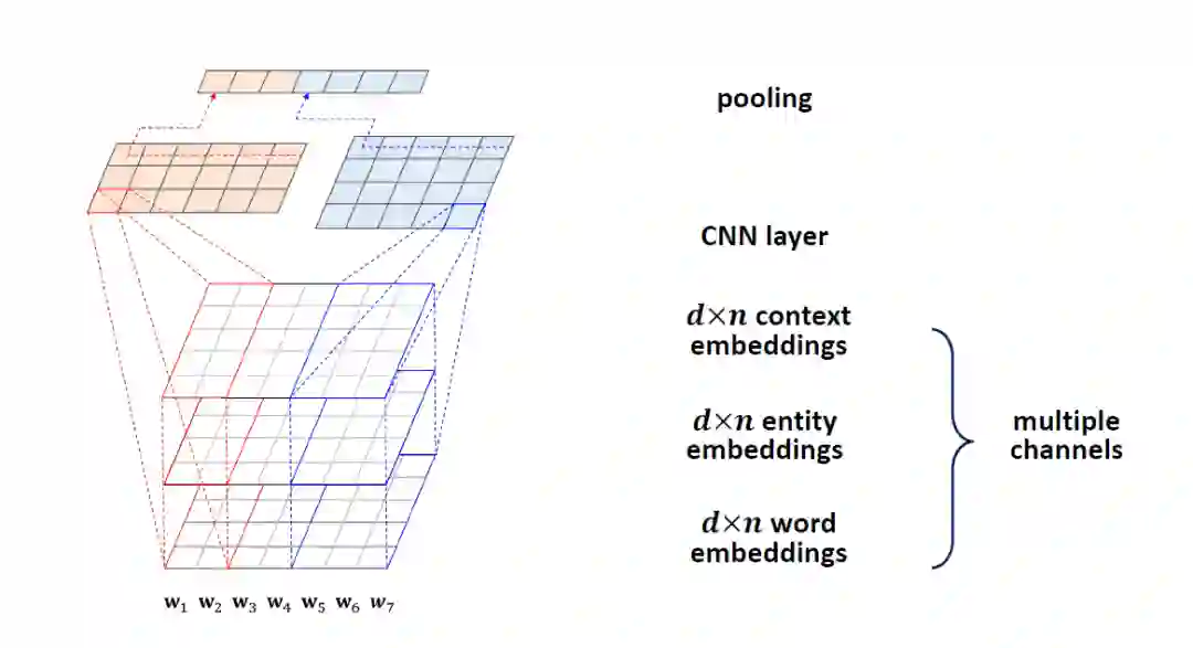 前面介绍中已有3种特征向量,分别是实体embeddings,上下文embeddings,word embedings,我们的方法是把这3种embeddings做一个累加,卷积,池化,最后得到这个sentence的embeddings,这种方法叫KCNN。