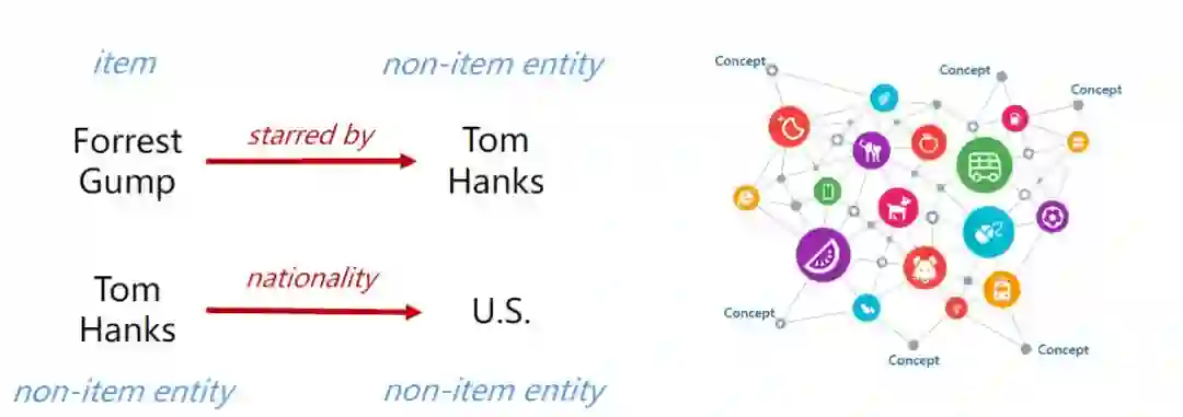 知识图谱 ( Knowledge Graphs, KG ) 也是一种辅助信息。KG是一个有向异构图 ( heterogeneous graph ),图中节点表示实体 ( entity ),边表示关系 ( relation )。