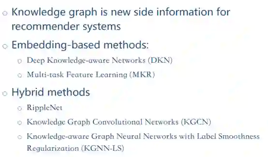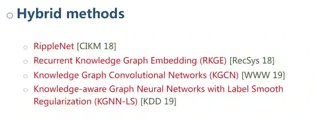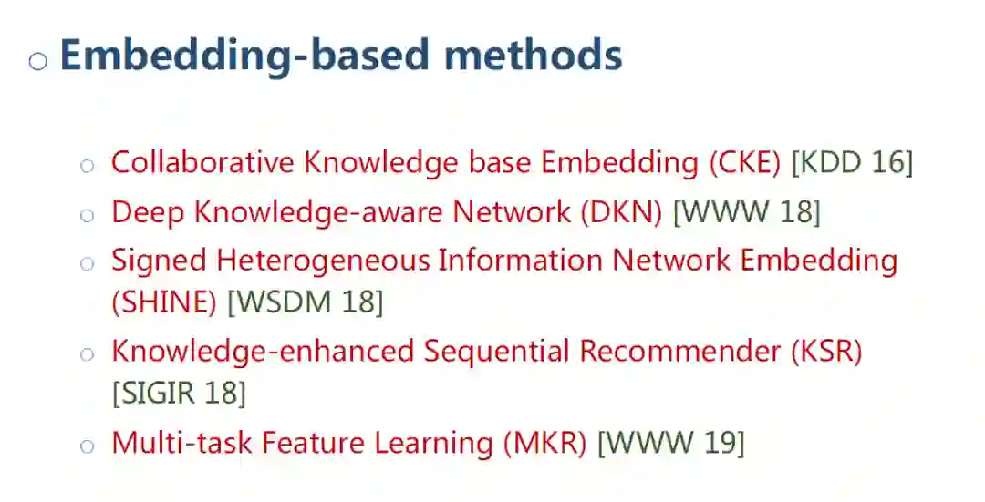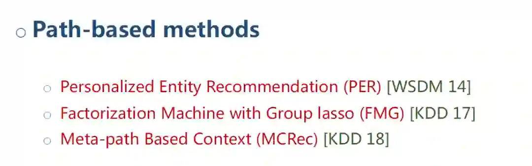 第二类是Path-based methods,基于KG计算路径的推荐方法,今天不会涉及这类方法。
