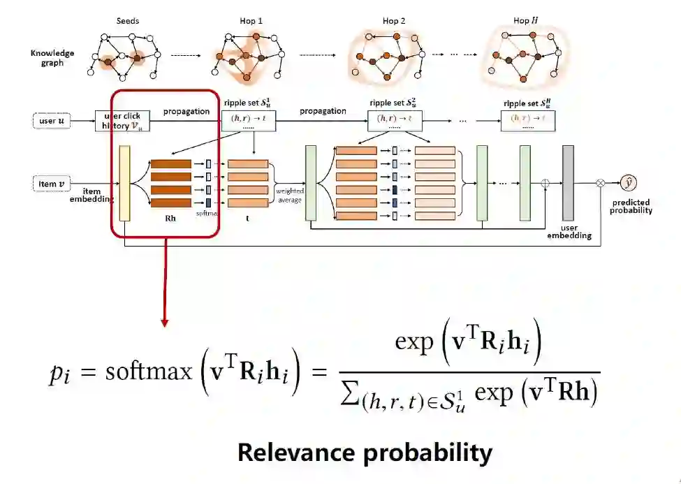 ,在KG中找到对应的Vu,比如图中有2个对应实体,获取这些实体对应的tuple,把实体一跳的集合拿出来。对输入物品v做embedding映射。如上公式,将item embedding v和这些head