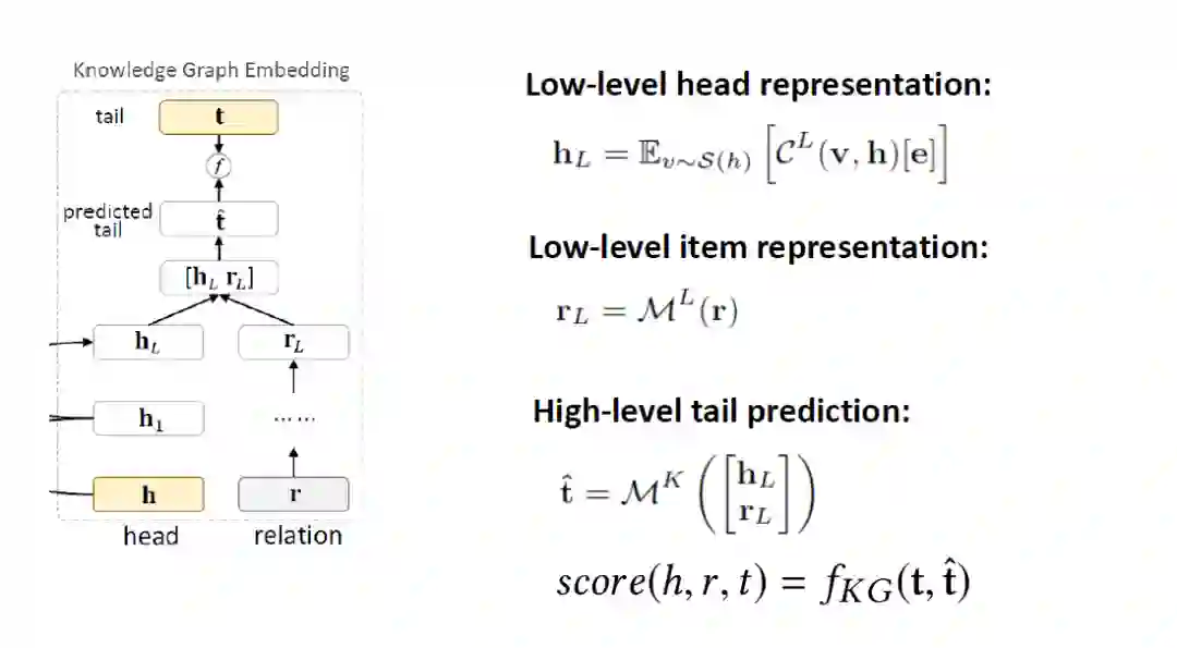 KGE模块,也分成low-lever和high-level部分,输入head,用cross&compress unites来做特征处理,relation用MLP做特征处理,把这2个处理结果拼接起来,经过一个K层的MLP,得到一个predictedtail,预测的tail和真实的tail用一个函数fKG算一个分值,这样就可以优化这个score值。