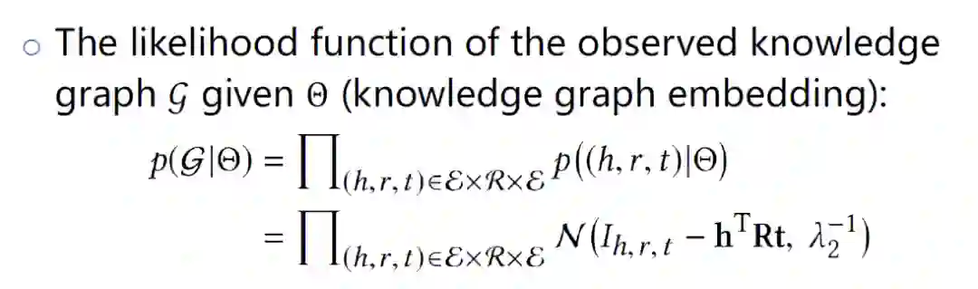第2项给定参数θ,KG的概率,这项对应的是KG的embedding部分。当(h,r,t)是正样本,