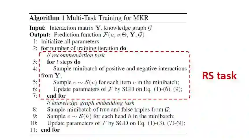 算法实现第1块是推荐系统的任务,第2块是KGE任务,交替训练2者。在每次循环里面,做t次的RS的任务训练,做1次的KGE任务训练,做t次RS训练是因为更关注RS任务,这个t是可以调整的,这就是MKR模型。