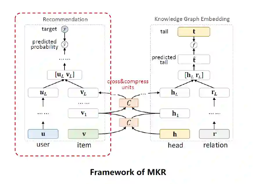 如上图为MKR框架,包括3个模块,一个是推荐模块,一个是knowledge graph embedding, KGE模块,还有一个是以上2个模块的桥梁,cross&compress units,交叉压缩单元,下面将分别阐述这3个模块。