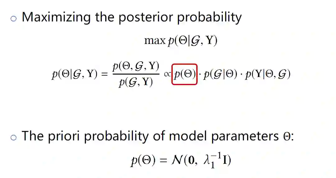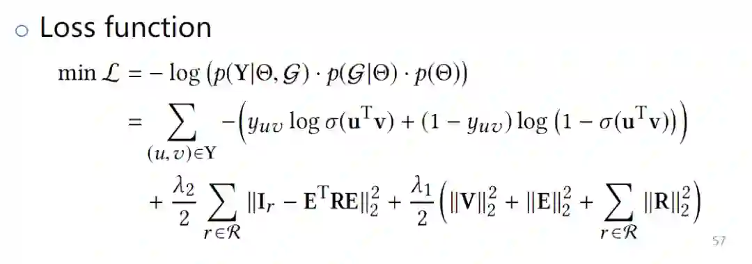 学习算法如上图,在已知KG和RippleNet系统情况下,学习参数,最大化后验概率。通过贝叶斯定理,可以把该公式拆成3个值。第1项是参数的先验分布,用上面这个公式来刻画这个先验概率分布p(θ),这项对应的是正则项loss。