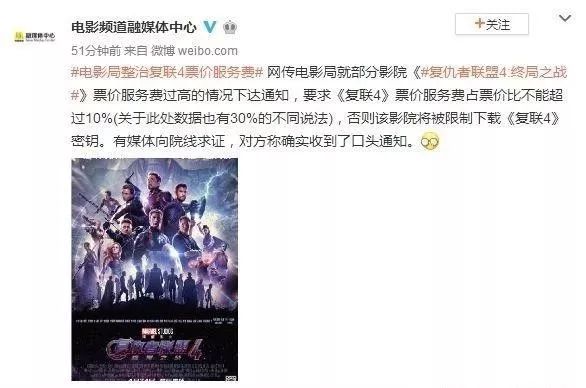 据@电影频道融媒体中心消息,网传电影局就部分影院《复仇者联盟4:终局之战》票价服务费过高的情况下达通知,要求《复联4》票价服务费占票价比不能超过10%(关于此处数据也有30%的不同说法)。