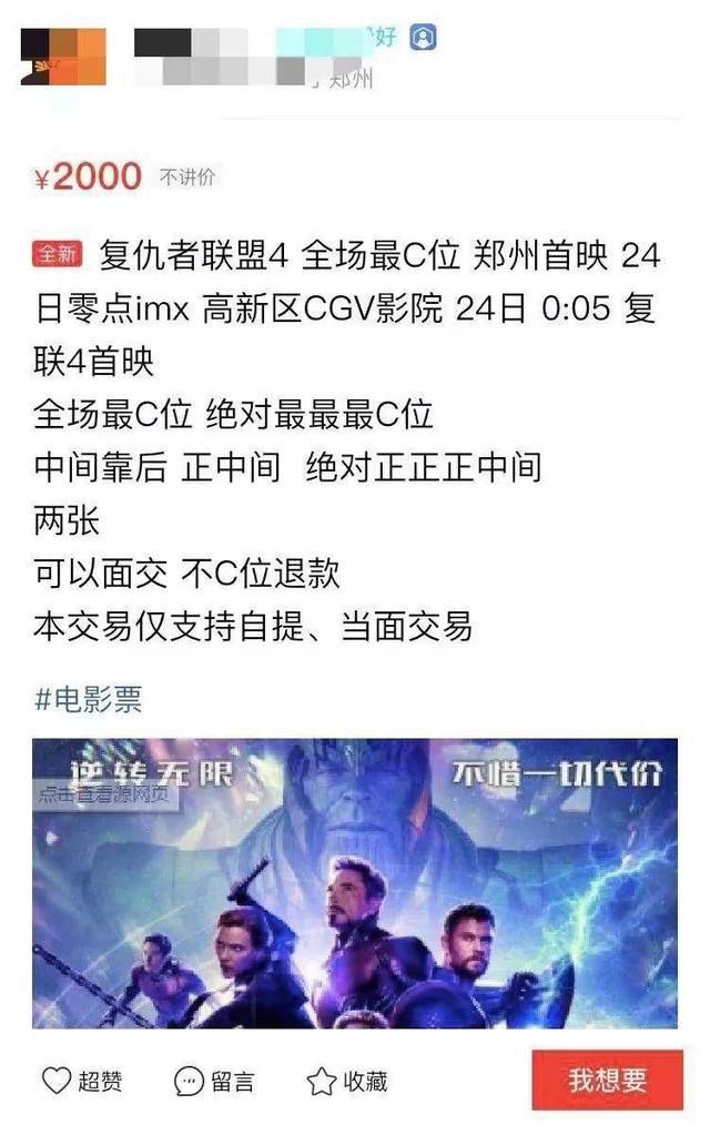 电影《复仇者联盟4》(以下简称《复联4》)定档4月24日,于4月12日开始预售,还有4天就要上映了,但是它的票价现在对小伙伴们来说是个困惑,票价过高。不管是普通3D,还是巨幕,《复联4》它的票价远远高于其他的电影。而近期的《复联4》在网络上流传的图片显示,它的电影票在闲鱼上甚至被炒到了2000元!2000元看一场电影?对于普通人来说价格还是有点高...针对这种情况,有关部门就出手了~