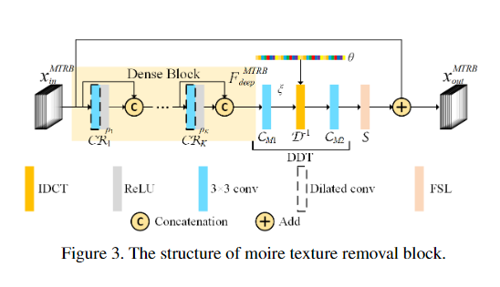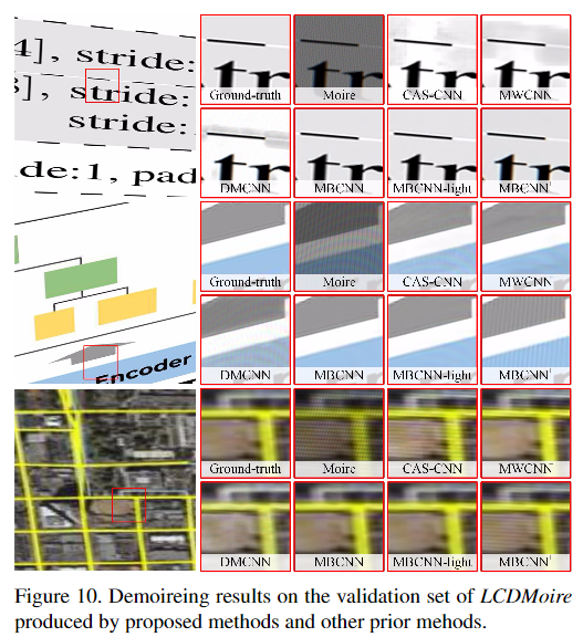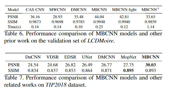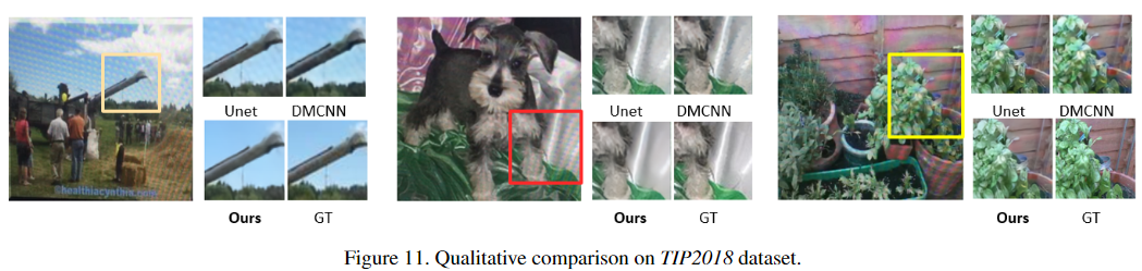数据集: LCDMoire(Aim 2019 challenge on image demoreing: datasetand study. InICCVW, 2019)、TIP2018( Moire photorestoration using multiresolution convolutional neural net-works.)