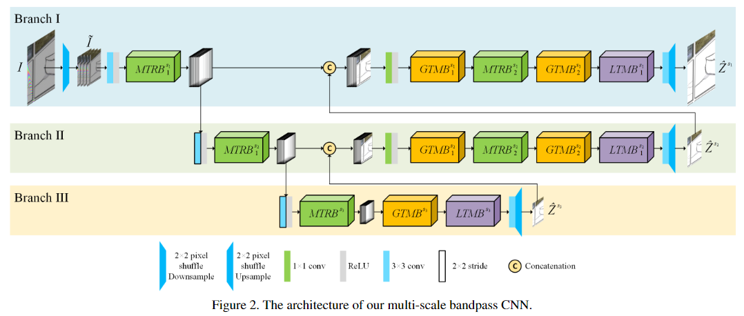 首先将具有h×w×c形状的输入图像I可逆地向下采样为四个h/2×w/2×4c形状的子图像。下面的网络由三个分支组成,每个分支用于恢复特定比例的波纹图像,同时每个分支顺序地执行摩尔纹去除和色调映射,最终输出放大后的图像,并将其融合到更小比例的分支中。在分支I和II中,将当前分支的特征和较粗的缩放分支的输出特征融合后,将其他GTMB和MTRB堆叠在一起,以消除缩放比例引起的纹理和颜色错误。