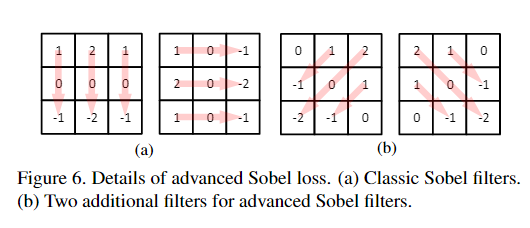 在本文中,将L1损失用作基本损失函数,因为已经证明 L1损失比L2损失对图像恢复任务更有效。但是,L1损失本身是不够的,因为它是无法提供结构信息的逐点损失,而摩尔纹是 structural artifact。本文提出了Advanced Sobel Loss(ASL)来解决此问题。