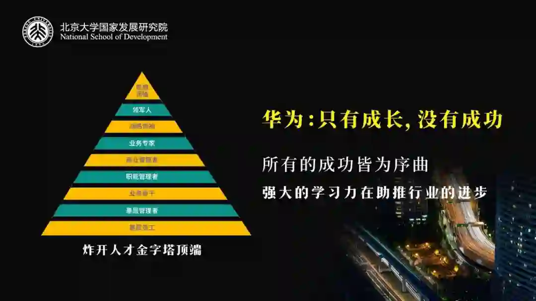 如果看一个人的成长,我们会发现,他是沿着一个金字塔的方向往上走的。任何一个普通人,不断的往上推,推到最后都可能会成为领袖。但华为认为这不重要,重要的是所有人都必须成长。所以华为炸开了人才金字塔,它把顶层炸掉。大家都知道从去年开始,华为开始轮值董事长,在更早之前轮值CEO,在这之前,他们的将军可以做班长。在全世界,华为的这种组织运作模式都是很特殊的。这种组织运作模式把金字塔顶层拿掉,让所有人都有成长的机会,在华为只有成长没有成功。