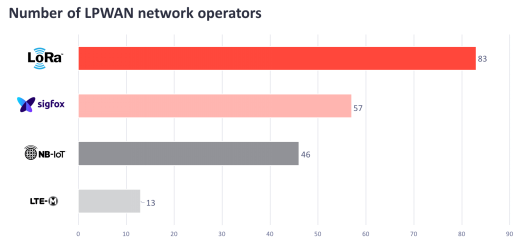 总体而言,与其他LPWAN技术相比,LoRaWAN运营商的范围最为分散。