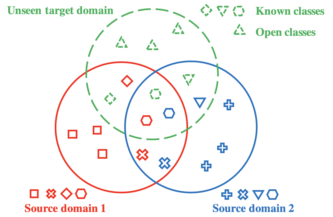 该问题中各源领域可能拥有不同的标签集,目标领域中包含了某些源领域中出现过的类别,也可能存在源领域中没有出现过的类别。学习的目的是从这些开放场景下的源领域上得到泛化性能较强的模型,使之能够在推理过程中直接对目标领域数据进行正确分类。若目标领域样本属于源领域标签集中的类别,则模型应将其分为源领域中的具体的那一类;若目标领域样本的类别未在源领域中出现,则应将其分为“未知类”。