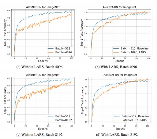 图 3:所有例子只运行 100 个 epoch。我们能明显观察到 LARS 学习率的影响。