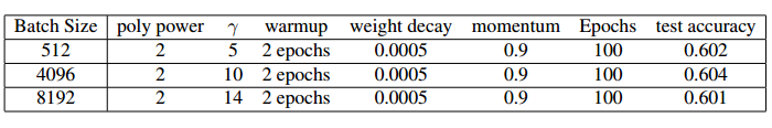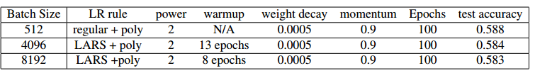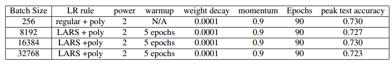 通过使用 LARS,我们能把 ResNet50 模型的 batch 大小扩展到 32K。我们使用 Batch-256 作为基线。在最高准确度上,8K 的 Batch 损失了 0.3% 的准确度,32K 的 Batch 损失了 0.7% 的准确度。我们相信这些准确度损失能够通过超参数调整弥补。我们的基线要比顶级的结果(7)(17)略低,因为我们并未使用数据增强。