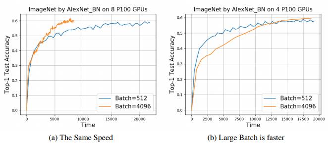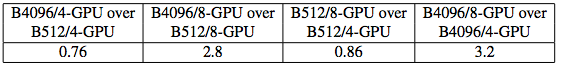 图 5:在 DGX-half(4 块 GPU)上,512 的 Batch 与 4096 的 Batch 有同样的速度。在 DGX(8 块 GPU)上,4096 的 Batch 是 512 Batch 速度的 2.6 倍。因此,大批量在计算能力增强的时候会有收益。