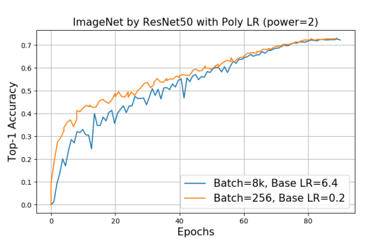 图 1:从这张图片中,我们可以清楚地看到我们使用 8k 批量大小的准确度和 256 批量大小的准确度在 90 个 epoch 中达到同等水平。该实验在一个 NVIDIA DGX-1 工作站上完成。