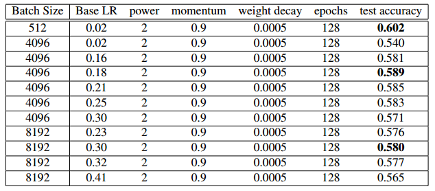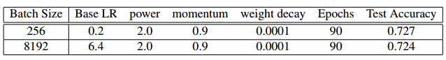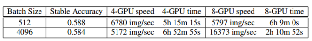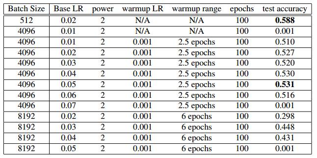 表 2:AlexNet 模型使用多个学习率策略在 ImageNet 数据集中的训练情况。我们使用学习率的线性缩放和预热策略,这些是 Facebook 论文(7)中使用的主要技术。