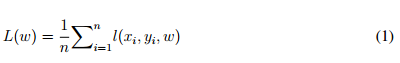 现在令 w 代表 DNN 的权重、X 代表训练数据、n 为 X 中的样本数,而 Y 代表训练数据 X 的标注。我们令 x_i 为 X 的样本,(x_i,w)为 x_i 和其标注 y_i(i ∈ {1, 2, ..., n))所计算出的损失。一般来说,我们使用如交叉熵函数那样的损失函数。DNN 训练的目标是最小化方程(1)中的损失函数。