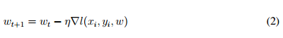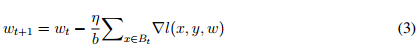 其中 η 为学习率。该方法被称作随机梯度下降(SGD)。通常,我们并不会只使用一个样本计算损失和梯度,我们每次迭代会使用一个批量的样本更新权重。现在,我们令第 t 次迭代的批量大小为 B_t,且 B_t 的大小为 b。然后我们就可以基于以下方程(3)更新权重: