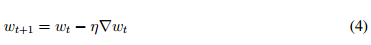 在第 t 次迭代中,我们使用前向和反向传播以求得损失函数对权重的梯度。然后,我们使用这个梯度来更新权重,根据梯度更新权重的方程(2)如下: