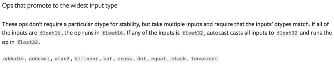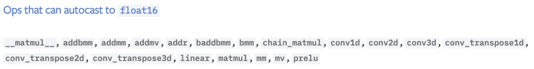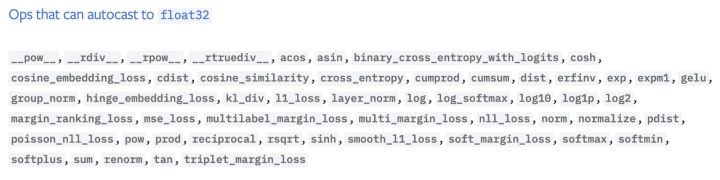 自动混合精度训练拼图的另一半是 torch.cuda.amp.autocast 上下文管理器。Autocast实现了 fp32-> fp16转换。回想一下“混合精度是如何工作的“中的内容,由于不同的操作以不同的速率累积误差,并非所有的操作都可以在 fp16中安全运行。下面的截图来自 amp 模块文档,介绍了autocast如何处理 PyTorch 中可用的各种操作: