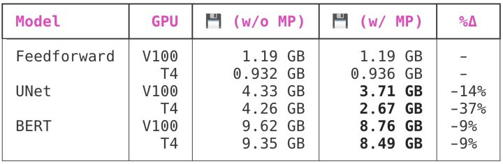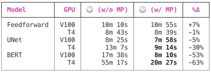 UNet 是一个中等规模的卷积模型,共有7,703,497个参数,从混合精度训练中得到了显著的好处。有趣的是,虽然 V100和 T4都受益于混合精度训练,但 T4的好处要大得多: 节省5%时间vs. 高达30%的时间。