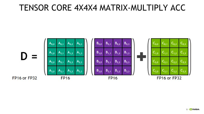 张量核是一种新型的处理单元,针对一个非常特殊的操作进行了优化: 将两个4 × 4 fp16矩阵相乘,然后将结果加到第三个4 × 4 fp16或 fp32矩阵(一个“融合乘法加(fused multiply add)”)中。