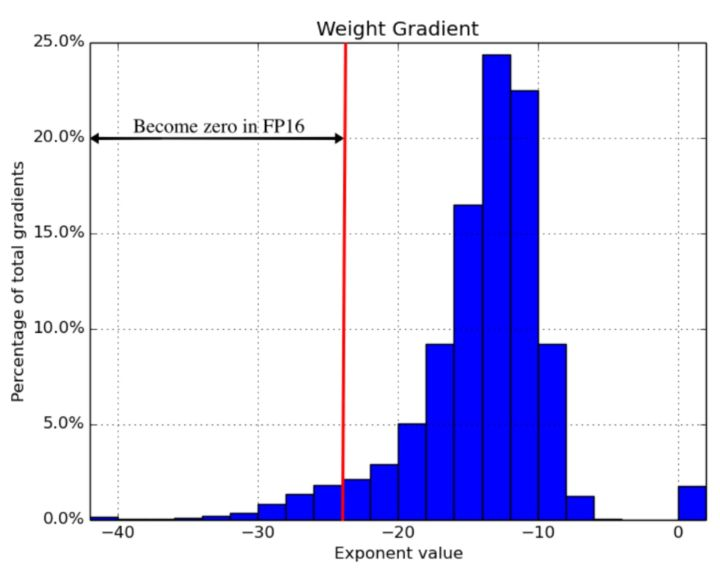 2018年ICLR论文 Mixed Precision Training 发现,简单的在每个地方使用 fp16 会“吞掉”梯度更新小于2^-24的值——大约占他们的示例网络所有梯度更新的5% :