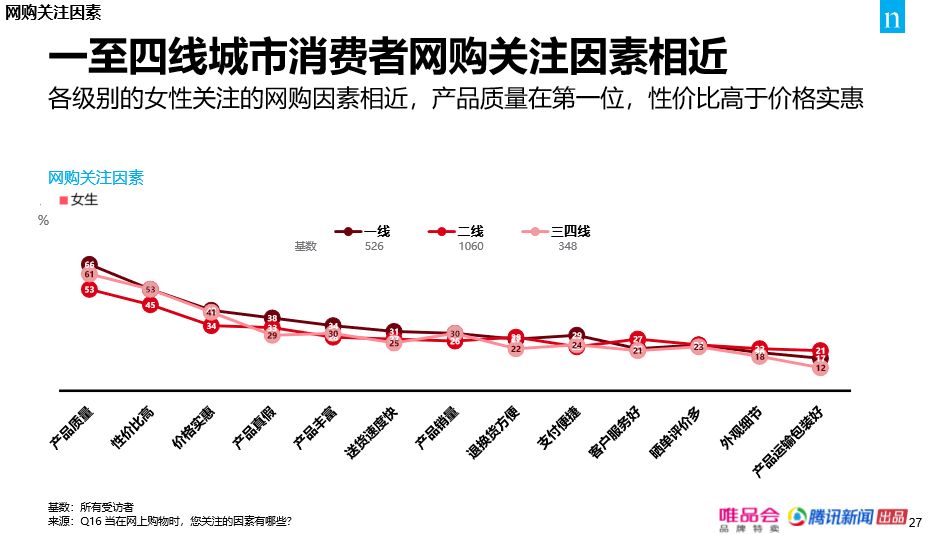不管是几线城市,消费者正变得越来越精明。数据显示,消费者网购决策最关注的前三项因素分别为产品质量、性价比高、价格实惠。消费者所关注的网购因素可称为“质价比”。其中,在购买服装配饰和个护化妆产品时,各线级城市女性对于精明的理解相似;质量、性价比是打动女性消费的永恒重点。近三年,性价比一词在唯品会平台的商品评价中占比显著提升。