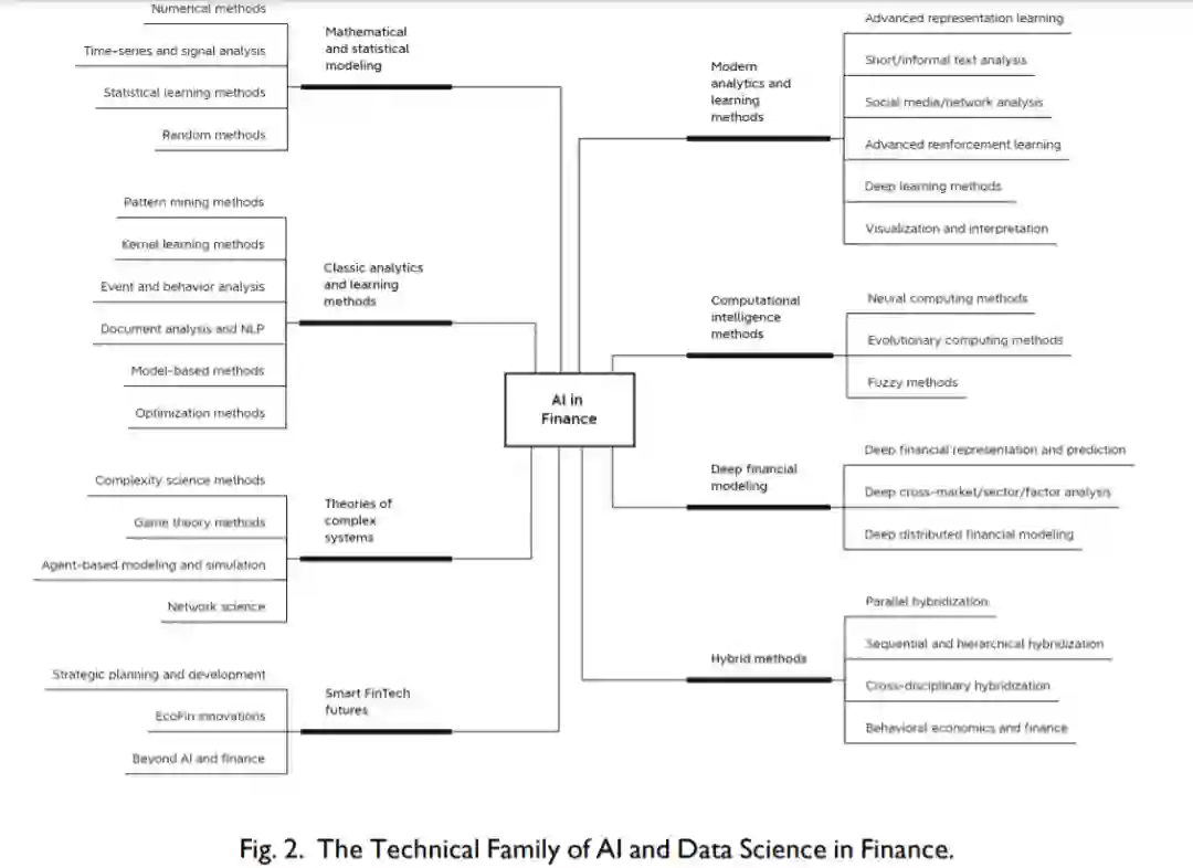 图1连接了主要的AIDS技术(上鳍)、EcoFin业务(下鳍)和它们的协同作用(如图脊所示)。共生体(金融科技鱼)培育了“智能金融科技”家族的多个合成领域: (1)智能金融核心业务,如智能银行、智能保险、智能贷款、智能交易、智能财富、智能区块链、智能支付和智能营销; (2) 经营、服务、决策智能化,如智慧监管、智慧风险、智慧安全、智慧会计、智慧审计、智慧治理、智慧运营、智慧管理; (3) 实现更智能的金融科技期货,如创造更智能的设计、规划和创新。我们开发了相应的辅助技术,以实现和自动化这些领域的“智能”,进一步产生相应的金融科技技术谱系:BankingTech、LendTech、WealthTech、tratech、PayTech、InsurTech、RiskTech和RegTech等。这些构成了“智能金融科技”的概念和家族。有兴趣的读者可以参考[32,33]和其他相关参考文献,了解这些不断发展的领域和技术。本文回顾的AIDS技术直接使上述智能金融科技业务转化为相应的智能金融科技技术。