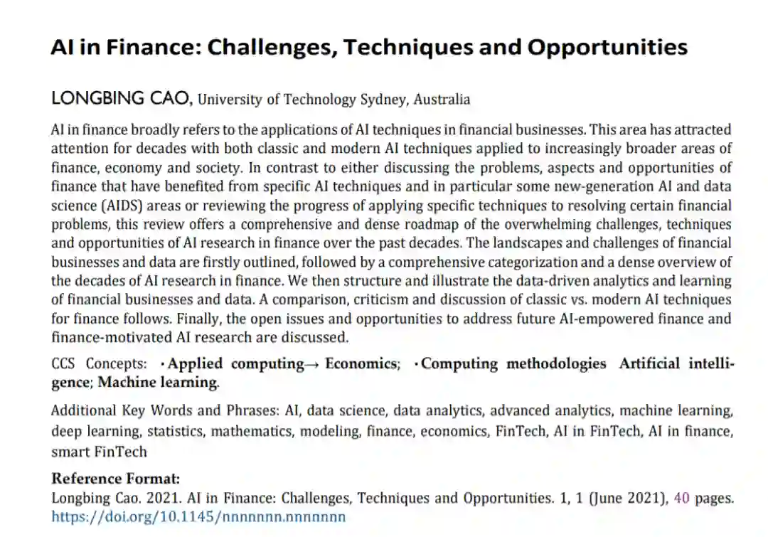 金融AI泛指人工智能技术在金融业务中的应用。几十年来,随着经典和现代人工智能技术被应用到金融、经济和社会等越来越广泛的领域,这一领域一直备受关注。与讨论特定人工智能技术,特别是新一代人工智能和数据科学(AIDS)领域所带来的金融问题、方面和机遇,或回顾应用特定技术解决特定金融问题的进展相比,这篇综述提供了一个全面而密集的路线图,概述了过去几十年金融领域人工智能研究面临的巨大挑战、技术和机遇。本文首先概述了金融业务和数据的前景和挑战,然后对金融领域数十年的人工智能研究进行了全面分类和密集概述。然后,我们构建和说明数据驱动的分析和学习的金融业务和数据。以下是对经典和现代金融AI技术的比较、批评和讨论。最后,讨论了未来人工智能授权金融和财务驱动的人工智能研究的未决问题和机遇。